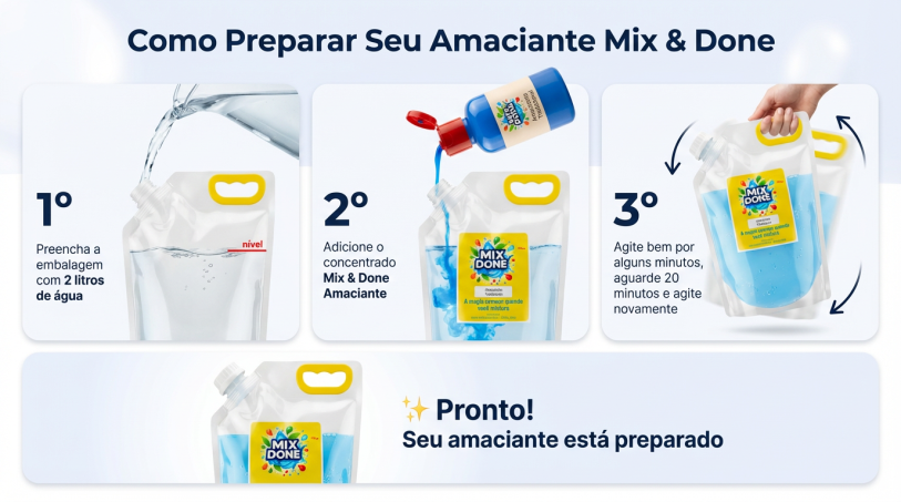 Por que escolher Mix Done? - Toque macio que você sente logo na primeira lavagem - Fragrância delicada e duradoura - Proteção das fibras para roupas sempre bonitas